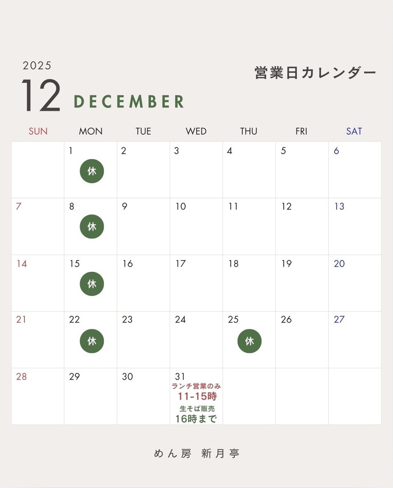 2025-11-30 お知らせ 12月営業日のお知らせ いつもありがとうございます。12月営業日のお知らせです。25日㈭ 休業29日㈪ 営業31日㈬ ランチのみ15時L.O. 生そば販売16時まで(なくなり次第終了)よろしくお願いいたします。 PDFを開く